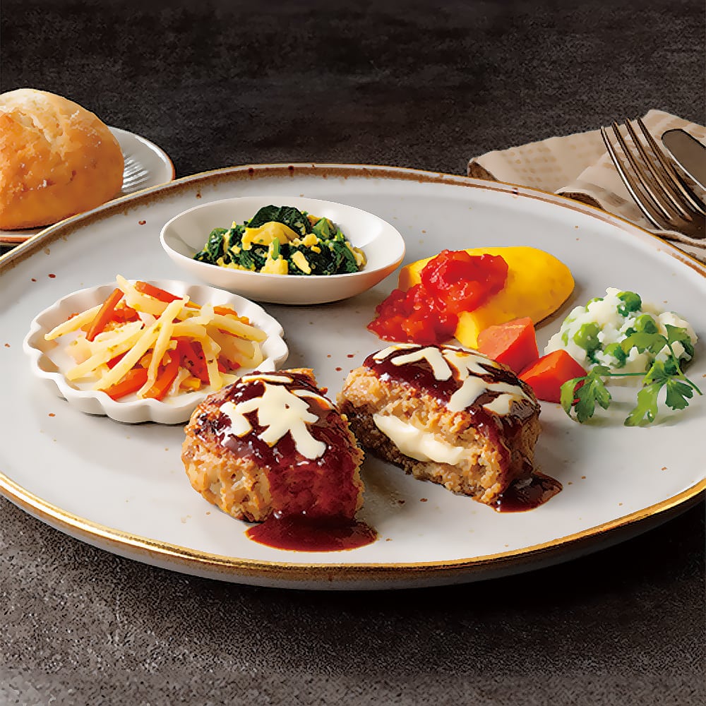 ハンバーグ(国内製造)(食肉(豚肉、牛肉)、たまねぎ、粒状植物性たん白、チー ズフード、パン粉、鶏卵、糖類(ぶどう糖、砂糖)、食塩、牛乳、発酵調味料、しょ うゆ、卵殻粉、香辛料、しょうゆ加工品、ゼラチン、にんにくペースト、チーズ、ワ イン、ポークブイヨン)、野菜(にんじん、菜の花、たまねぎ、ばれいしょ、たけの こ、グリンピース)、オムレツ(鶏卵、卵白、粉末鶏卵、乳又は乳製品を主要原料と する食品、卵黄、植物油脂、還元水あめ、バター、砂糖、鶏卵加工品、食塩、チキン エキスパウダー、香辛料)、鶏卵加工品、トマト・ピューレーづけ、デミグラスソー ス、牛乳、チーズ、酢、デキストリン、甘味果実酒、植物油脂、トマトケチャップ、 ソテーオニオン、マーガリン、砂糖、デミグラス風ソース、ワイン、トマトペースト 、コンソメパウダー、ウスターソース、食塩、かつおぶしエキスパウダー、酵母エキ スパウダー、にんにくペースト、香辛料、チキンエキスパウダー/加工でん粉、糊料 (加工でん粉、増粘多糖類)、調味料(アミノ酸等)、着色料(カラメル、カロチノ イド)、乳化剤、酢酸Na、クエン酸、セルロース、リン酸塩(Na)、香辛料抽出物、 香料、乳酸Ca、グリシン、(一部に小麦・卵・乳成分・牛肉・さば・大豆・鶏肉・豚 肉・りんご・ゼラチンを含む)