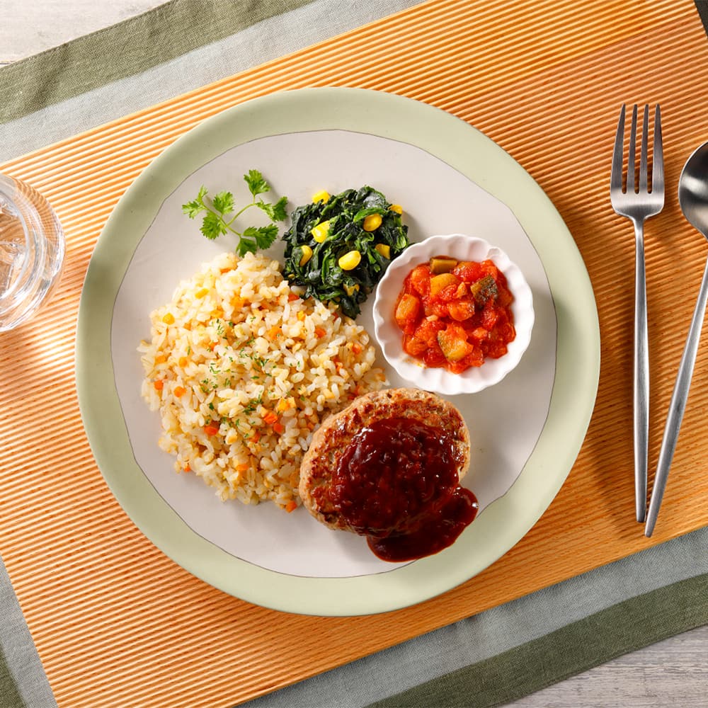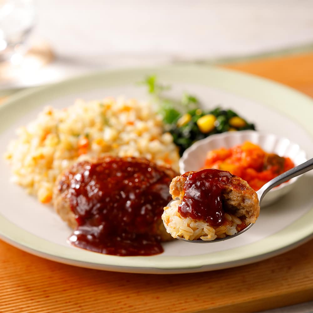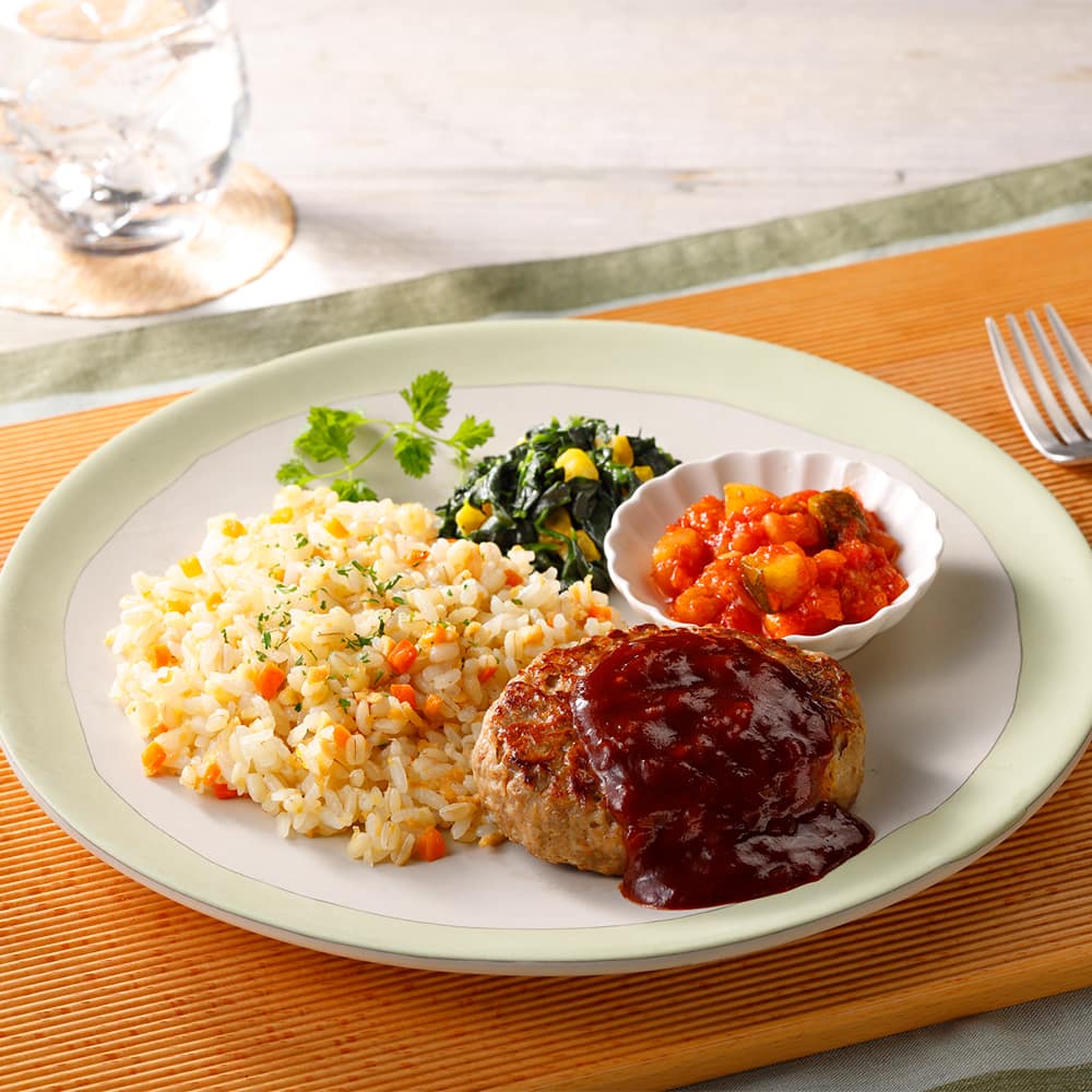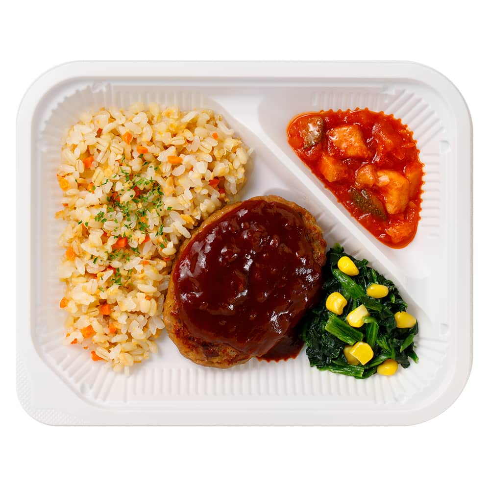 ハンバーグ(国内製造)(食肉(豚肉、牛肉)、たまねぎ、粒状植物性たん白、パン粉、鶏卵、発酵調味料、糖類(ぶどう糖、砂糖)、食塩、しょうゆ、牛乳、卵殻粉、香辛料、にんにくペースト、ゼラチン、ワイン、ポークブイヨン)、野菜(たまねぎ、ほうれん草、にんじん、コーン)、米、大麦(もち麦)、トマト・ピューレーづけ、デミグラスソース、鶏肉、揚げズッキーニ、コラーゲンペプチド、大豆、トマトペースト、粒状植物性たん白、トマトケチャップ、ワイン、マーガリン、植物油脂、バター、しょうゆ、コンソメパウダー、デミグラス風ソース、食塩、砂糖、香辛料、にんにくペースト、酵母エキスパウダー、チキンエキスパウダー/加工でん粉、着色料(カラメル)、糊料(加工でん粉、増粘多糖類)、調味料(アミノ酸等)、クエン酸Na、グルコン酸Na、炭酸K、重曹、乳化剤、タウマチン、香料、乳酸Ca、(一部に小麦・卵・乳成分・牛肉・大豆・鶏肉・豚肉・ゼラチンを含む)お気に入りとは