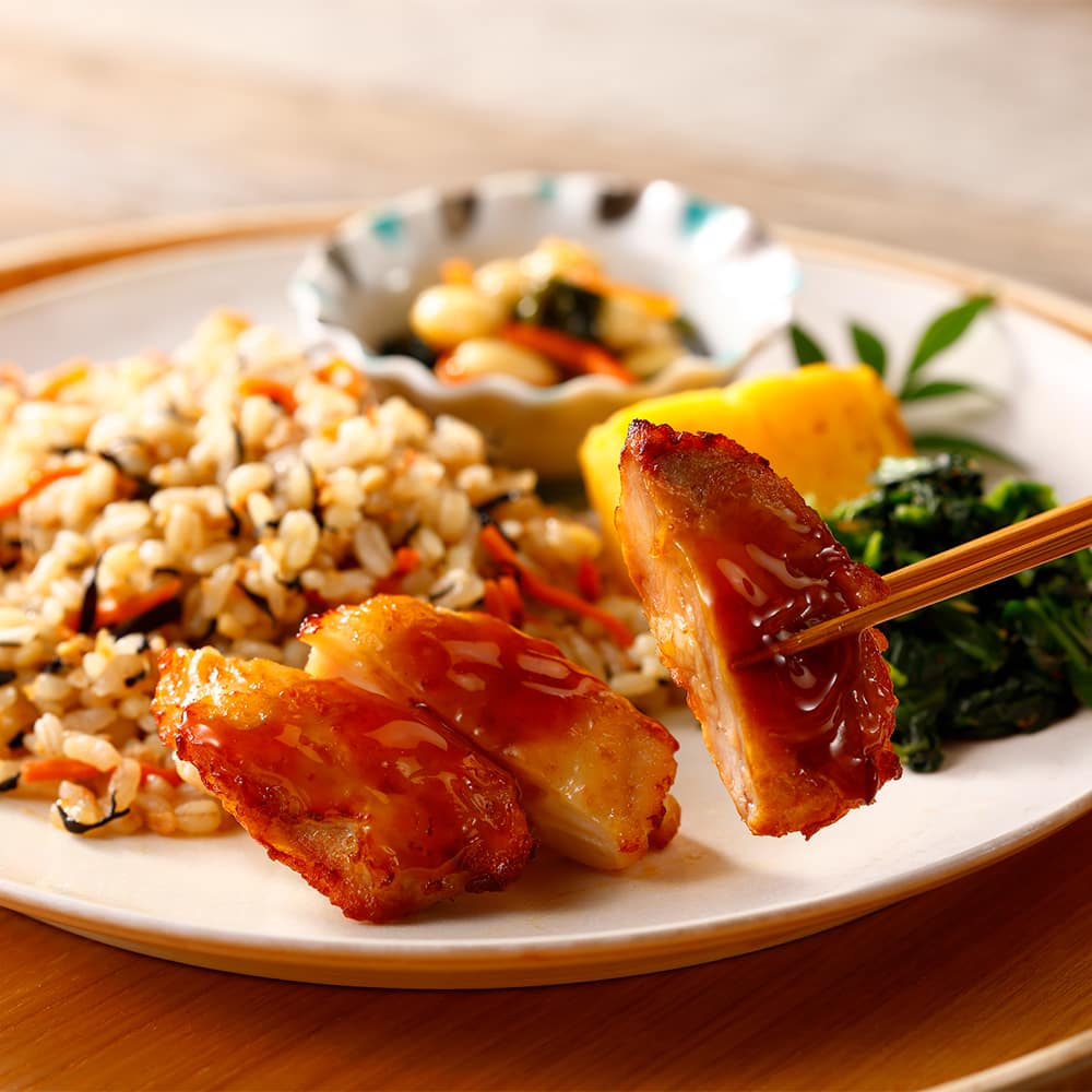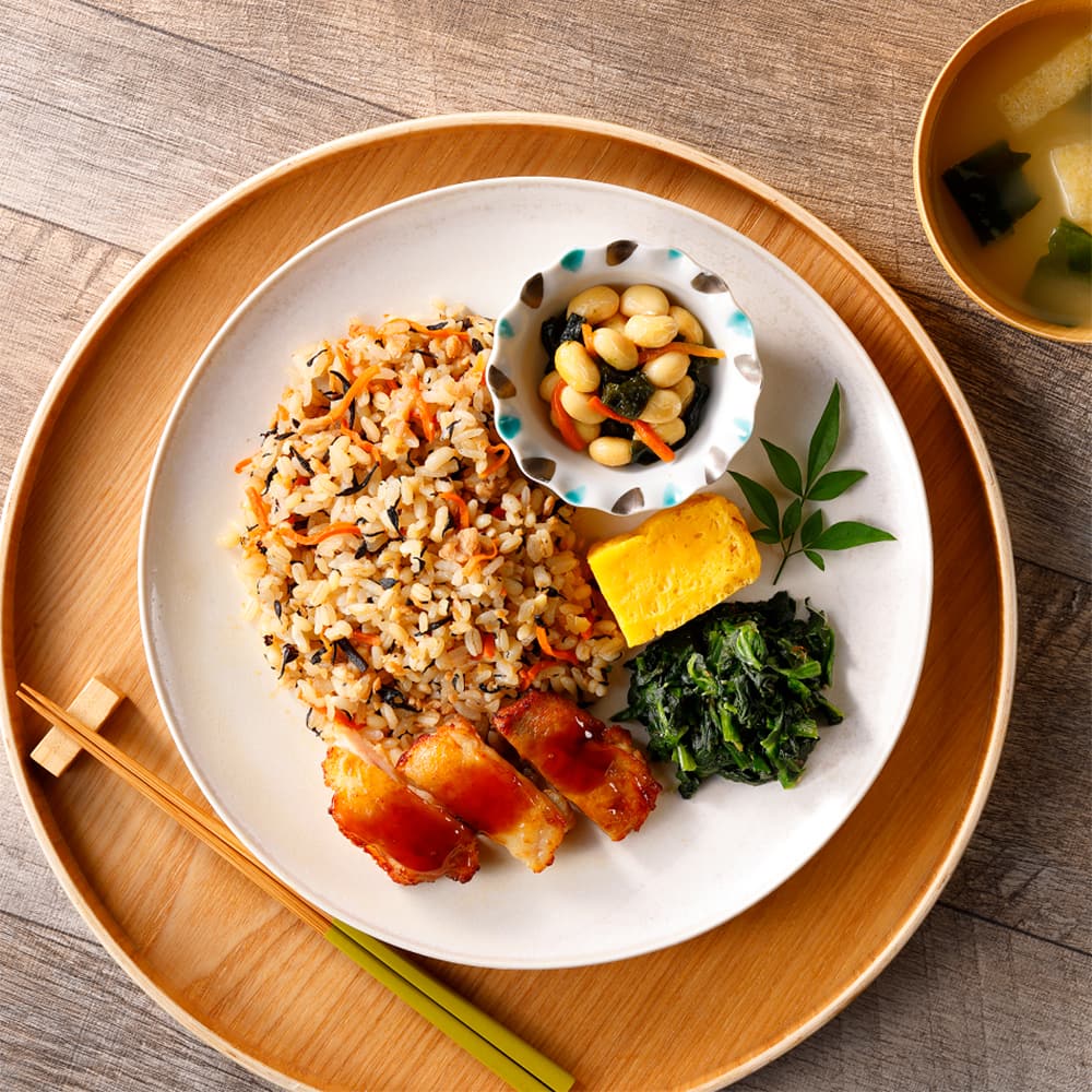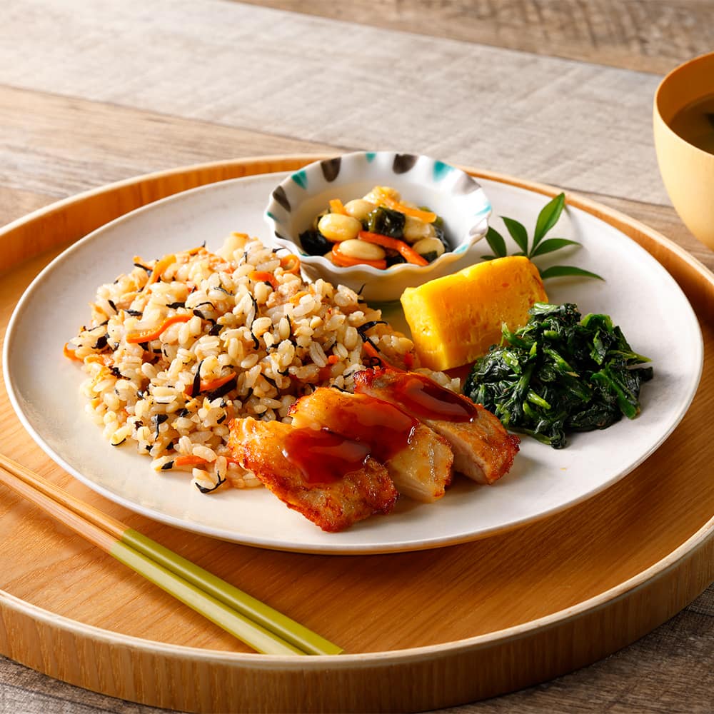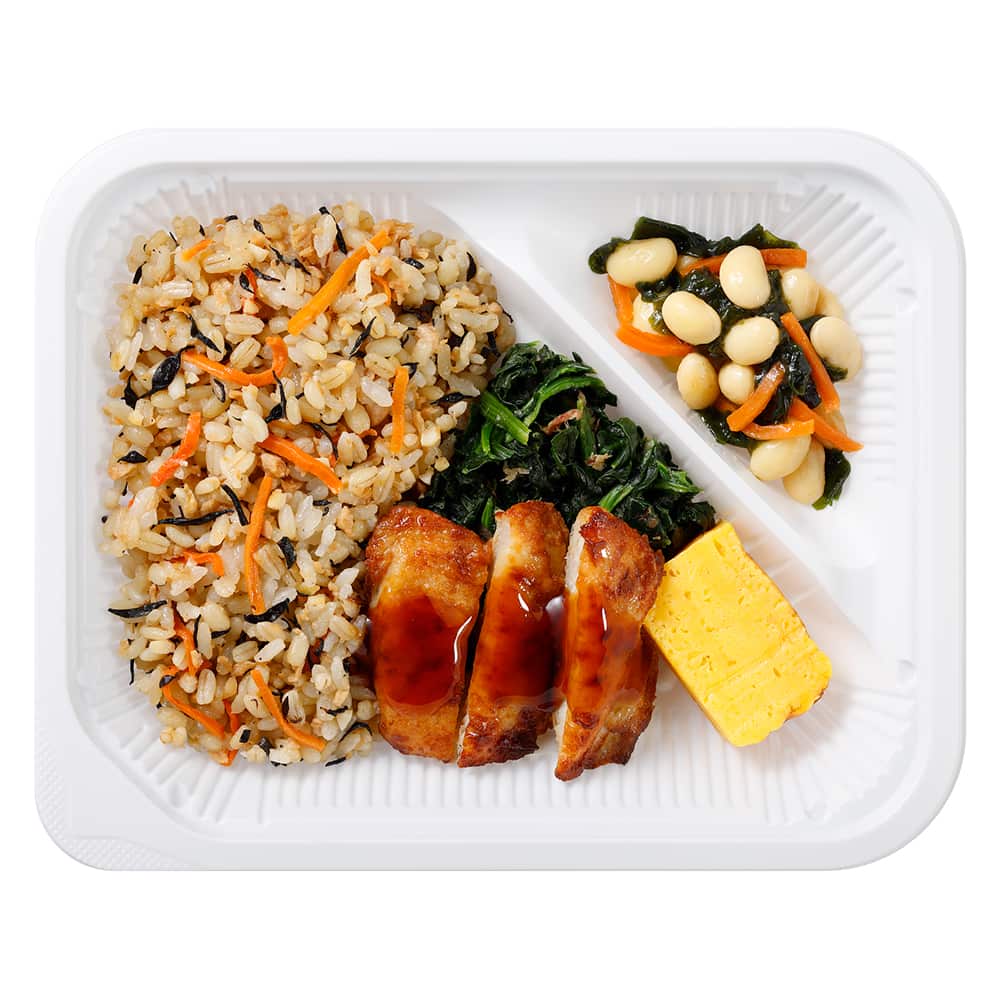 米(国産)、鶏肉加工品(鶏肉、でん粉、酒、植物油脂、食塩、粉末卵白、ぶどう糖、粉末状植物性たん白、小麦粉、にんにくペースト、香辛料、コーンフラワー、しょうが汁、米粉、脱脂粉乳)、大麦(もち麦)、野菜(ほうれん草、にんじん)、大豆、厚焼き卵(鶏卵、砂糖、植物油脂、みりん、酢、しょうゆ、食塩、かつおだし)、ひじき、しょうゆ、わかめ、しょうゆだれ、粒状植物性たん白、植物油脂、砂糖、みりん風調味料、酒、コラーゲンペプチド、かつおぶしエキスパウダー、かつお削りぶし/加工でん粉、グリシン、増粘剤(加工でん粉)、調味料(アミノ酸等)、リン酸塩(Na)、キシロース、着色料(カラメル、カロチノイド)、乳化剤、タウマチン、(一部に小麦・卵・乳成分・さば・大豆・鶏肉・ゼラチンを含む)お気に入りとは