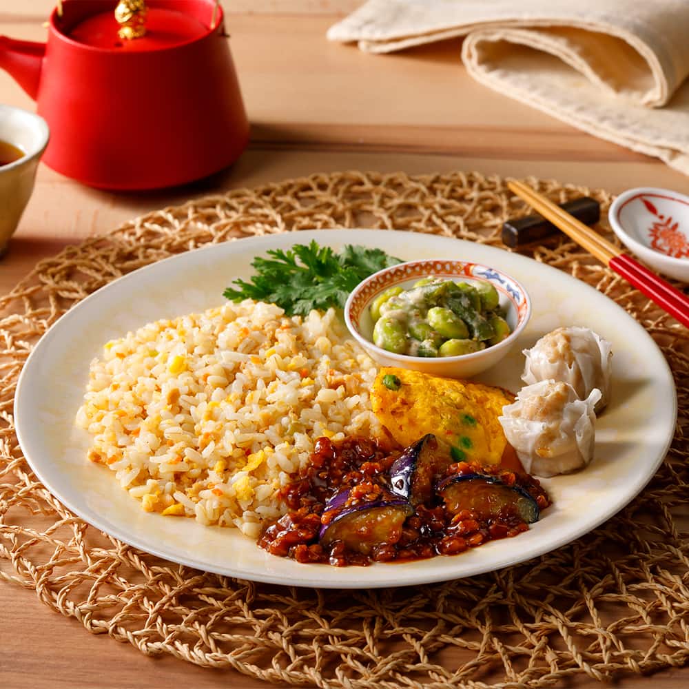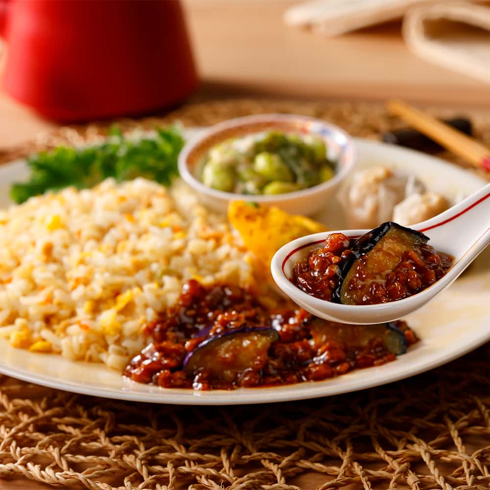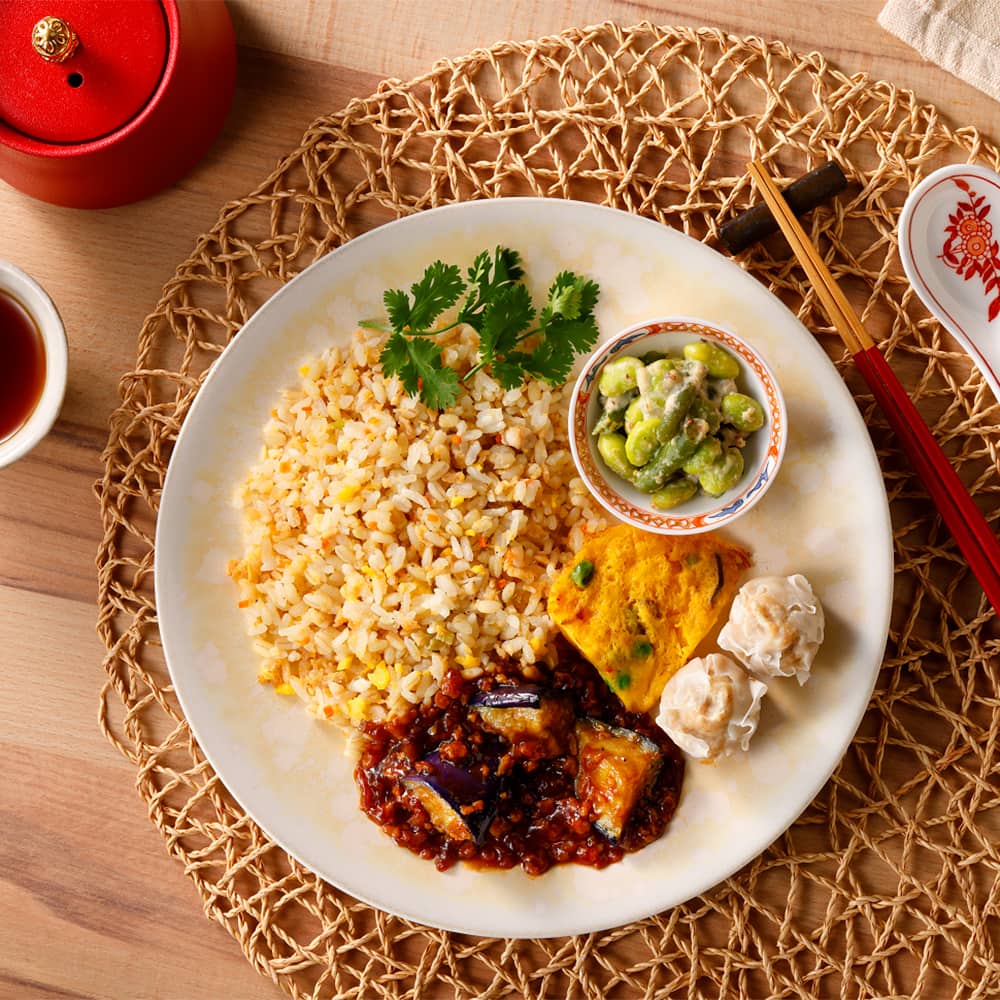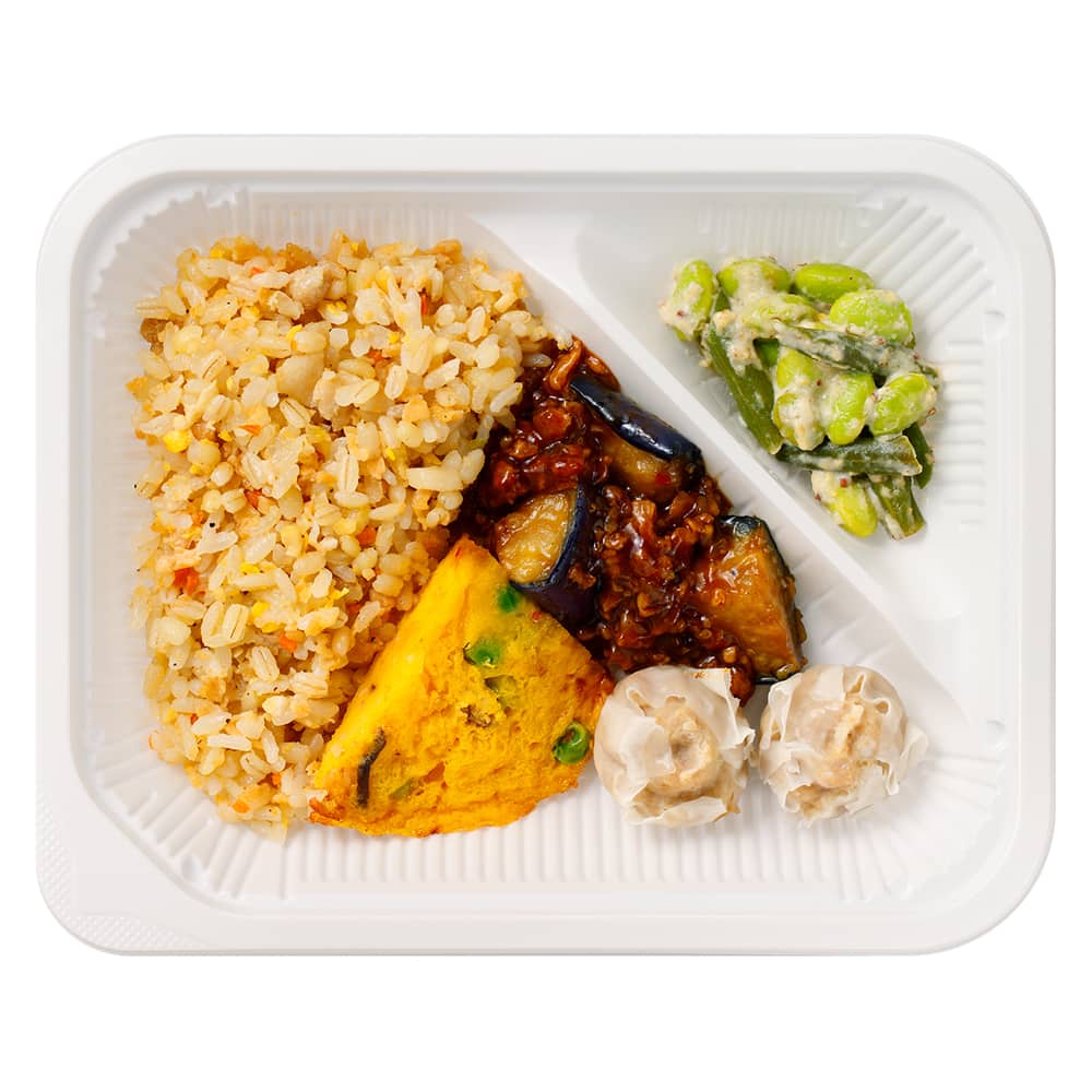 揚げなすにピリ辛の麻婆ソースをかけた麻婆ナスに、かに玉と肉シューマイ、もちぷち食感のもち麦と大豆入りの炒飯風ごはんと一緒にお楽しみ頂けます。