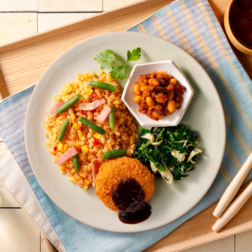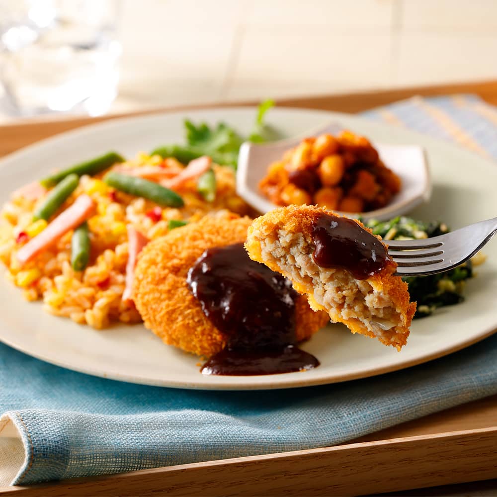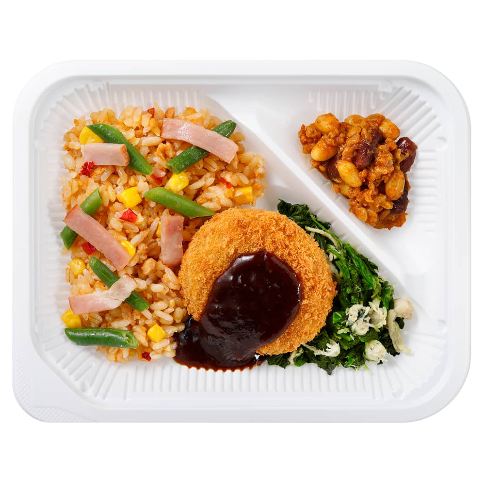 野菜(ほうれん草、たまねぎ、コーン、いんげん、ピーマン)、メンチカツ(国内製造)(パン粉、食肉(鶏肉、豚肉)、たまねぎ、粒状植物性たん白、豚脂、植物油脂、砂糖、でん粉、粉末状植物性たん白、小麦粉、中濃ソース、しょうゆ、食塩、デキストリン、ポークブイヨン、粉末しょうゆ、ラード、香辛料、ポークエキス、ゼラチン、たん白加水分解物、香味油、酵母エキス、粉末卵白)、米、大麦(もち麦)、大豆、デミグラスソース、味付鶏肉、いんげんまめ、植物油脂、ベーコン、コラーゲンペプチド、トマトケチャップ、豚肉、粒状植物性たん白、デキストリン、トマトペースト、ワイン、コンソメパウダー、ソテーオニオン、マーガリン、ウスターソース、にんにくペースト、砂糖、デミグラス風ソース、バター、香辛料、食塩、カレー粉/加工でん粉、調味料(アミノ酸等)、糊料(加工でん粉、増粘多糖類)、着色料(カラメル、クチナシ、カロチノイド)、酢酸Na、カゼインNa、乳化剤、リン酸塩(Na)、くん液、クエン酸Na、発色剤(亜硝酸Na)、香辛料抽出物、香料、(一部に小麦・卵・乳成分・大豆・鶏肉・豚肉・りんご・ゼラチンを含む)お気に入りとは