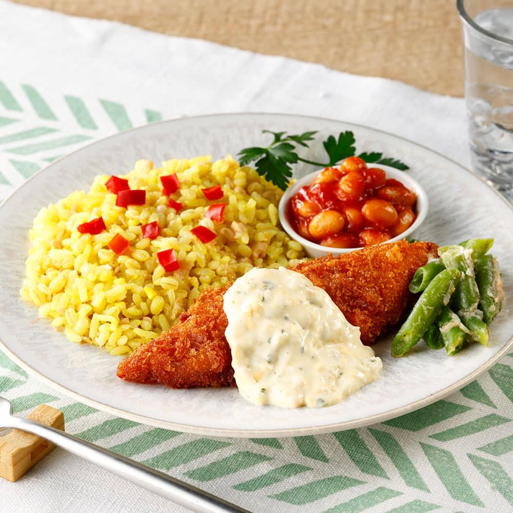 白身フライ(すけとうだら(ロシア)、パン粉、小麦粉、食塩、でん粉、米粉、植物油脂、粉末状植物性たん白)、米、野菜(いんげん、たまねぎ、ピーマン)、大麦(もち麦)、大豆、マヨネーズ風ドレッシング、トマト・ピューレーづけ、植物油脂、鶏卵加工品、粒状植物性たん白、コラーゲンペプチド、まぐろ油漬け、乳又は乳製品を主要原料とする食品、牛乳、米飯調味液、トマトペースト、マーガリン、コンソメパウダー、にんにくペースト、しょうゆ、食塩、香辛料、砂糖、酢、チキンエキスパウダー/加工でん粉、増粘剤(加工でん粉、増粘多糖類)、調味料(アミノ酸等)、膨張剤、乳化剤、リン酸塩(Na)、着色料(カロチノイド)、酢酸Na、香辛料抽出物、グリシン、(一部に小麦・卵・乳成分・大豆・鶏肉・豚肉・りんご・ゼラチンを含む)